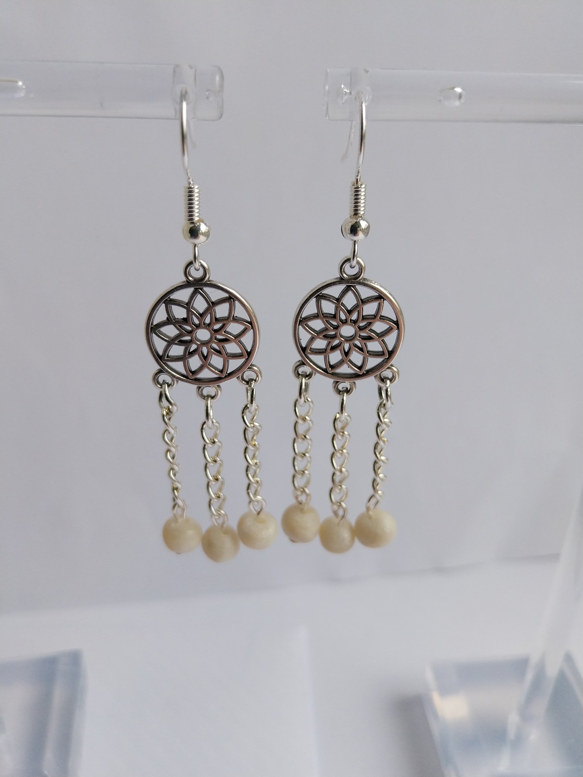 With dreamcatcher vibes, these statement earrings feature bohemian antique silver mandala's, silver plated chain and handmade mother of pearl effect clay beads. All topped off with silver plated ear hooks.