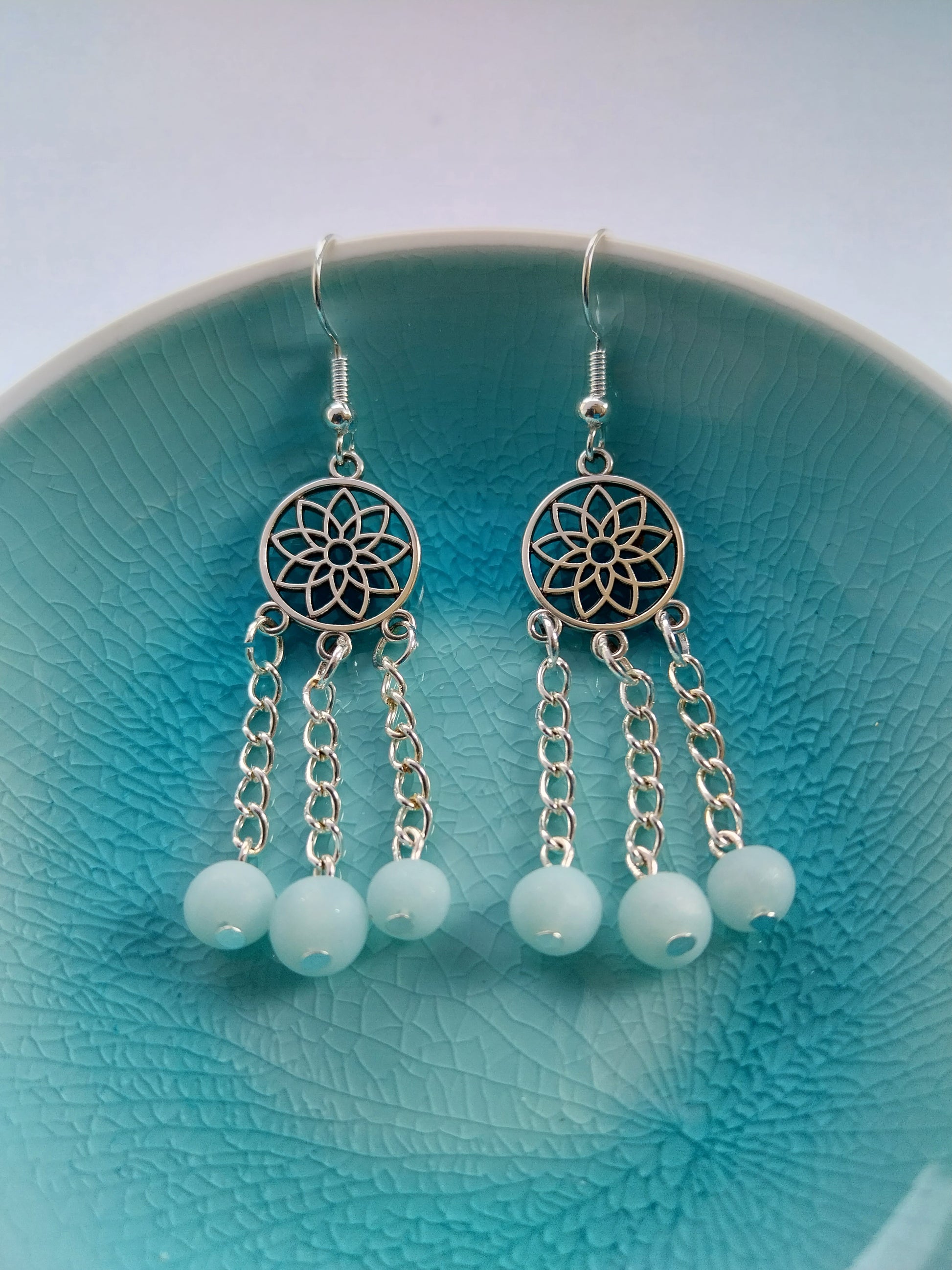 With dreamcatcher vibes, these statement earrings feature bohemian antique silver mandala's, silver plated chain and handmade blue ice quartz effect clay beads. All topped off with silver plated ear hooks.