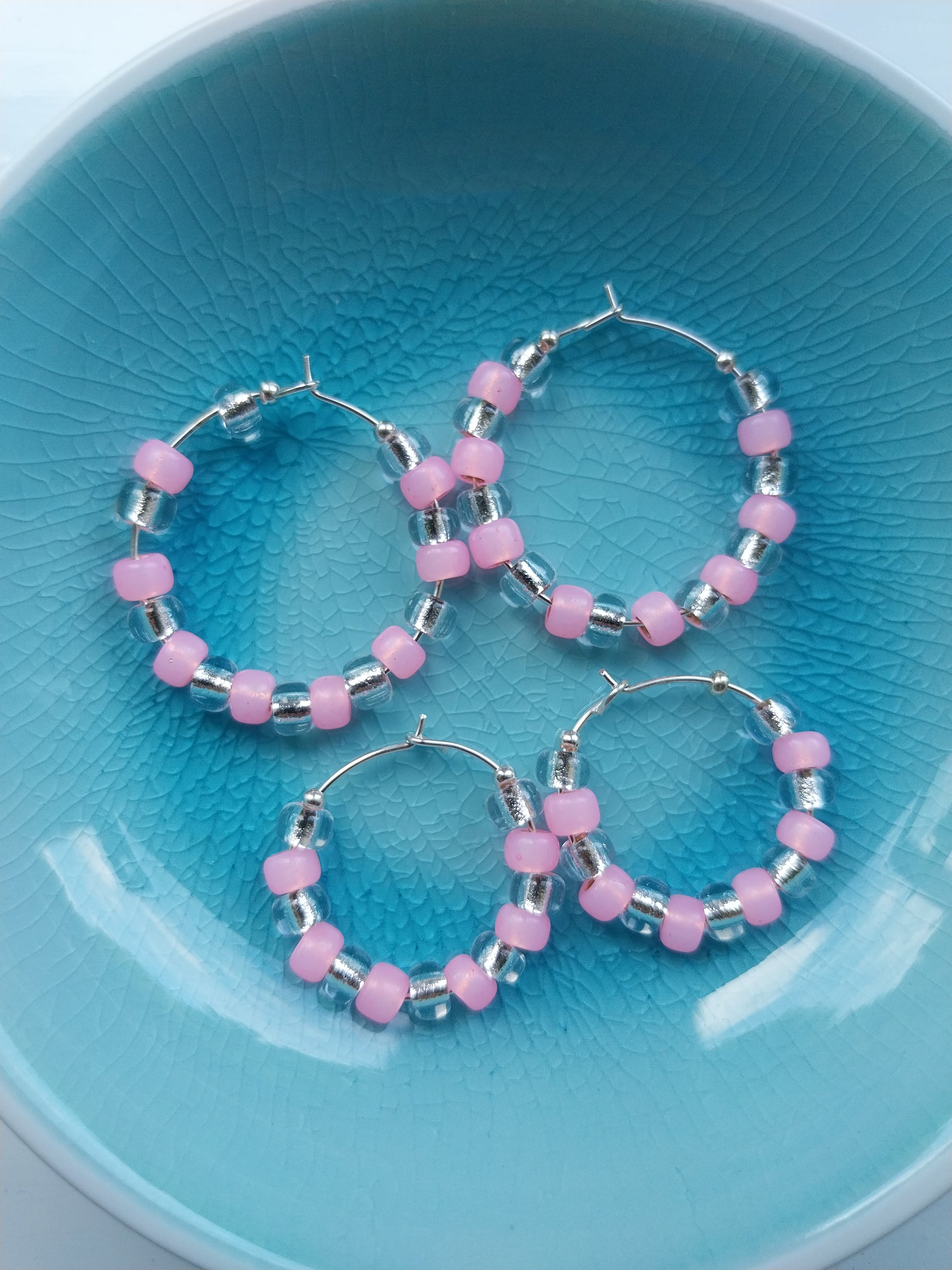 Our fabulously adorable silver and pink bead hoop earrings showcase shiny glass beads on silver hoops. Sparkling and sweet, these earrings put a playful spin on traditional hoops. The shiny glass beads and feminine pink colour make them a fun accessory.