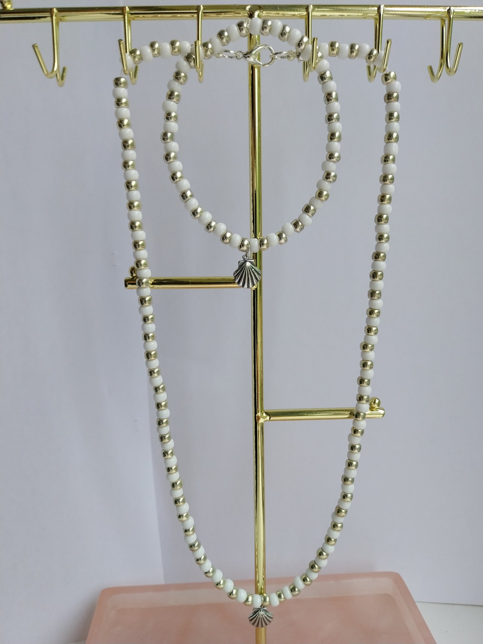 Get into the summer mood with our Summer Silver Shell Necklace. Evoking holiday vibes, this necklace features gorgeous glass beads in white and silver, a sterling silver shell charm and a silver plated clasp. Pictured here with our matching silver shell charm bracelet.